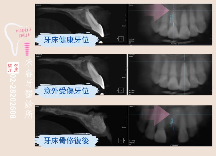 由於林先生在意外後延誤了就醫時間,齒槽骨已感染嚴重,呂睿庭醫師做完例行檢查並與患者討論需求後,建議進行做「雷射微創修補」手術同時置入骨粉及再生膜,非但不破壞剩餘的健康牙齦及骨床組織,也能同時刺激生物組織再生,進而加速病人的恢復期,所以傷口較小,流血及疼痛程度也會減少,傷口癒合容易,降低病患害怕的困擾。